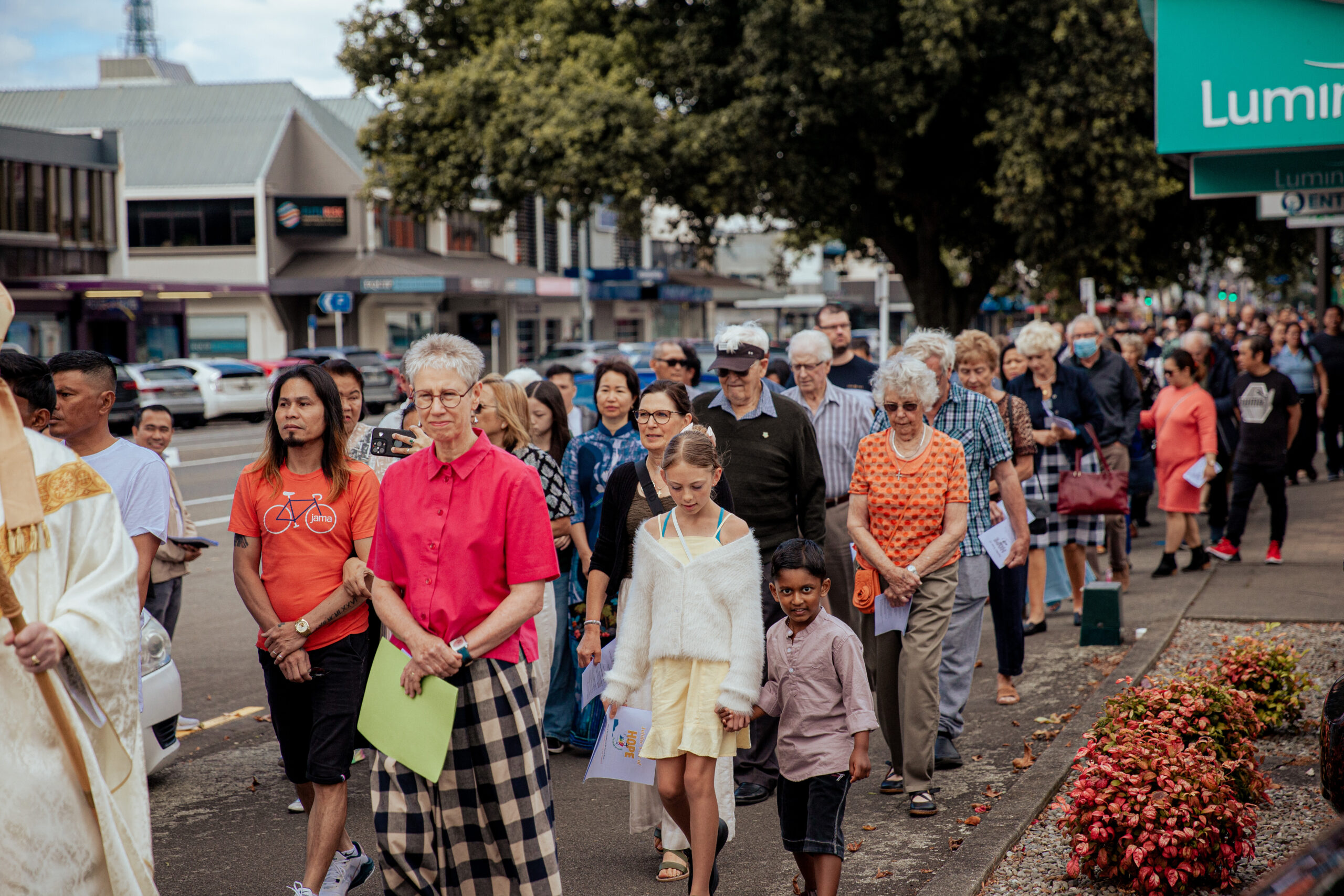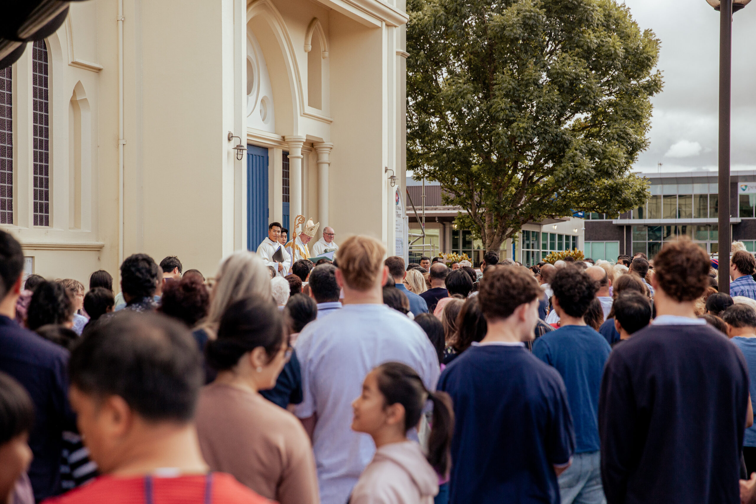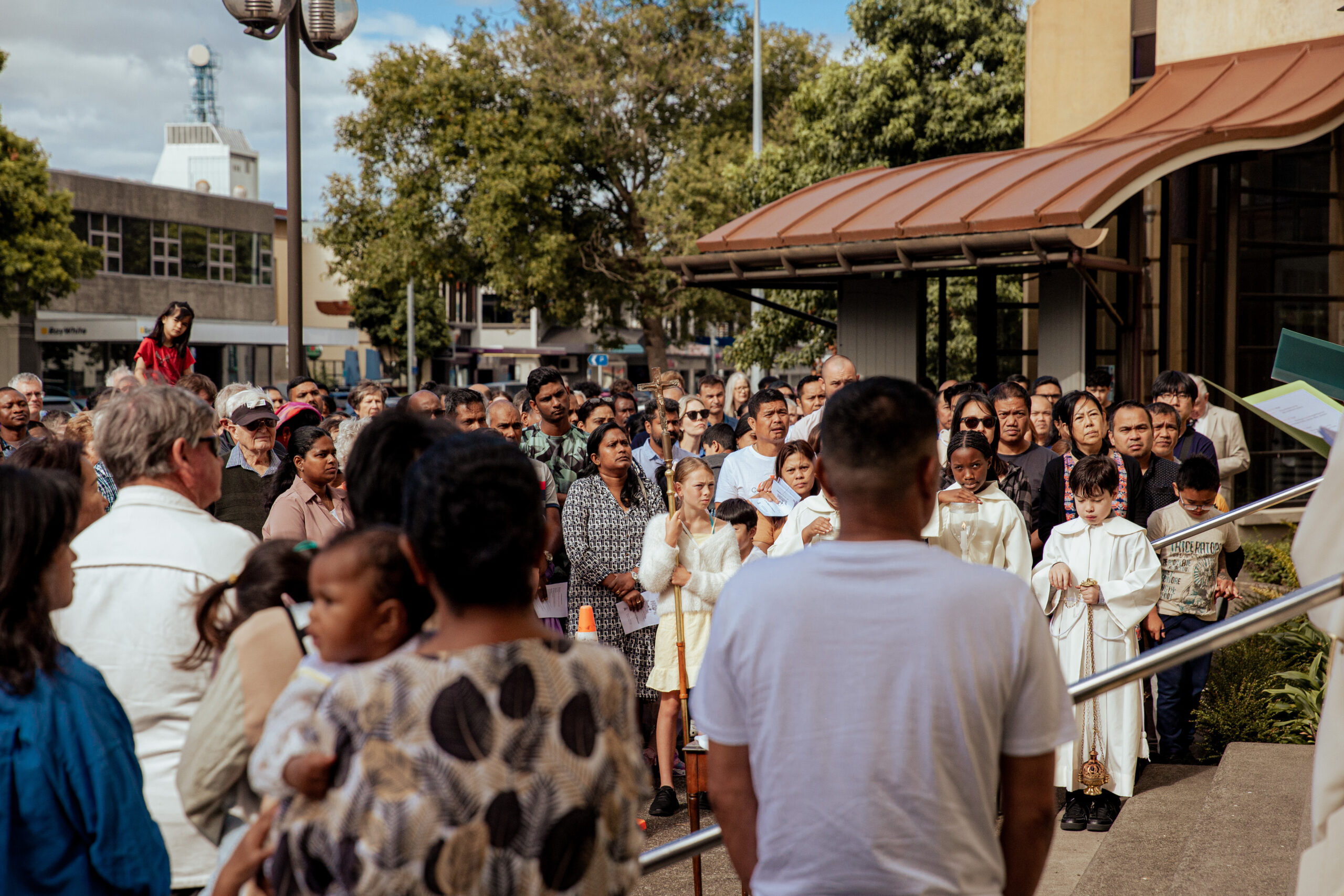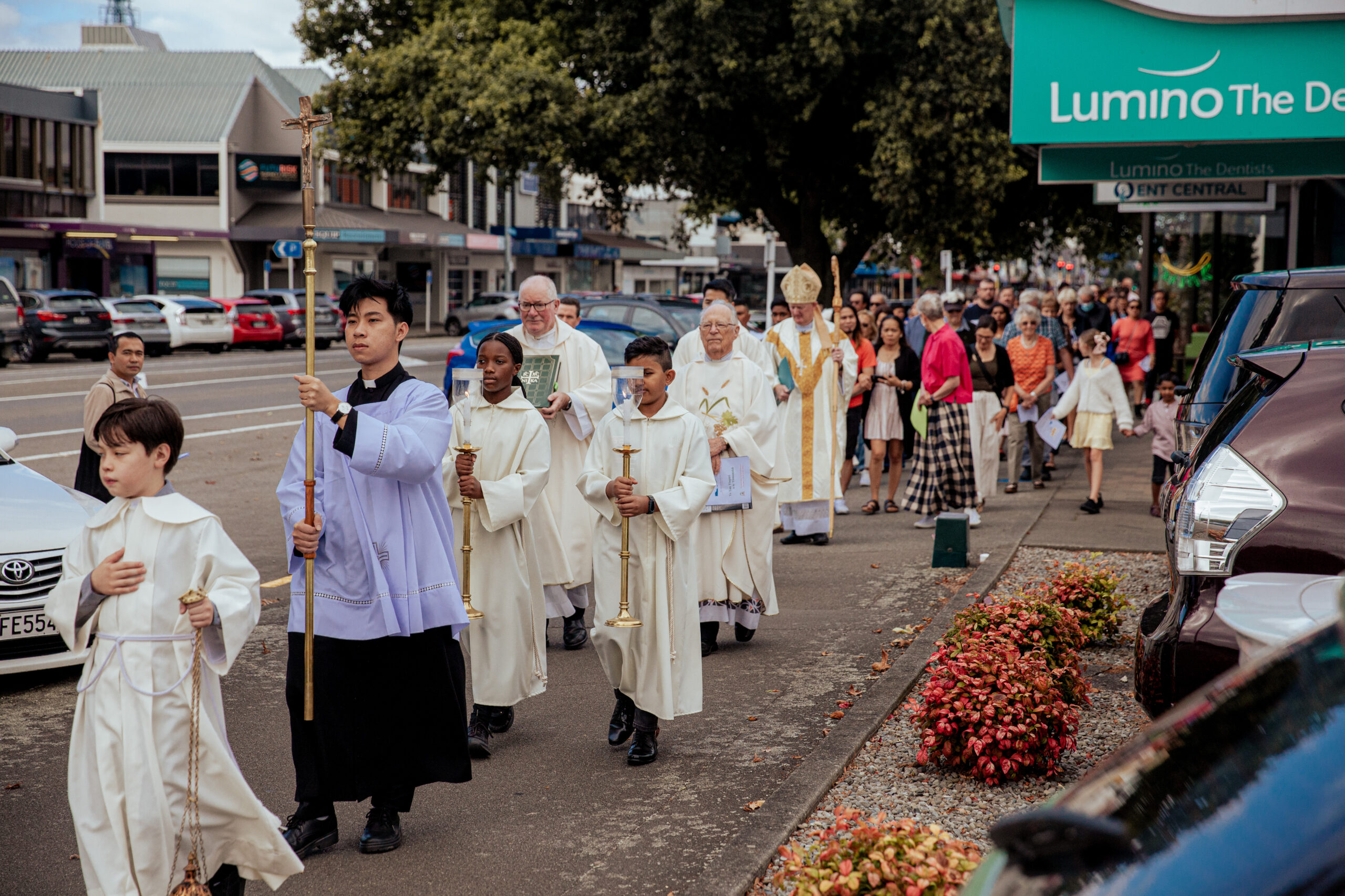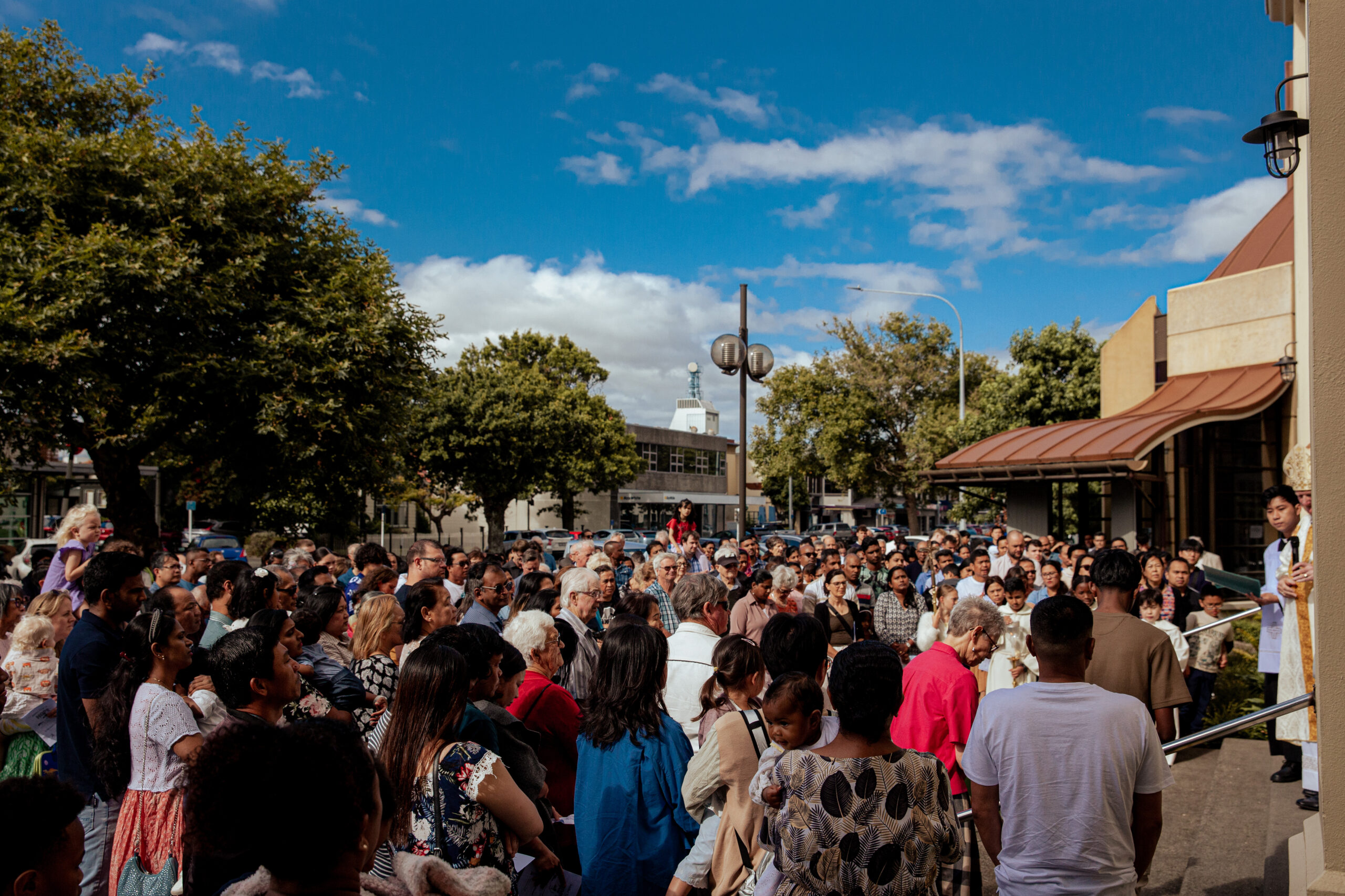 Mass was presided over by Bishop John Adams, assisted by Emeritus Bishop Peter Cullinane, Monsignor Brian Walsh, and Fr Vui Hoang. The liturgy began outside the Diocesan Centre behind the Cathedral, where, fortunately, the rain had stopped just in time. A karanga welcomed those gathered, followed by prayers led by Bishop John. The congregation then processed along Broadway Avenue to the steps of the Cathedral, symbolising the beginning of our pilgrim journey in this Jubilee Year. At the Cathedral doors, Bishop John offered further prayers before blessing the entrance and proclaiming the start of the journey ahead. The Proclamation of Pope Francis’ Papal Bull was then read aloud before the Cathedral doors were opened, and Bishop John led the congregation inside, where the Mass continued as usual.