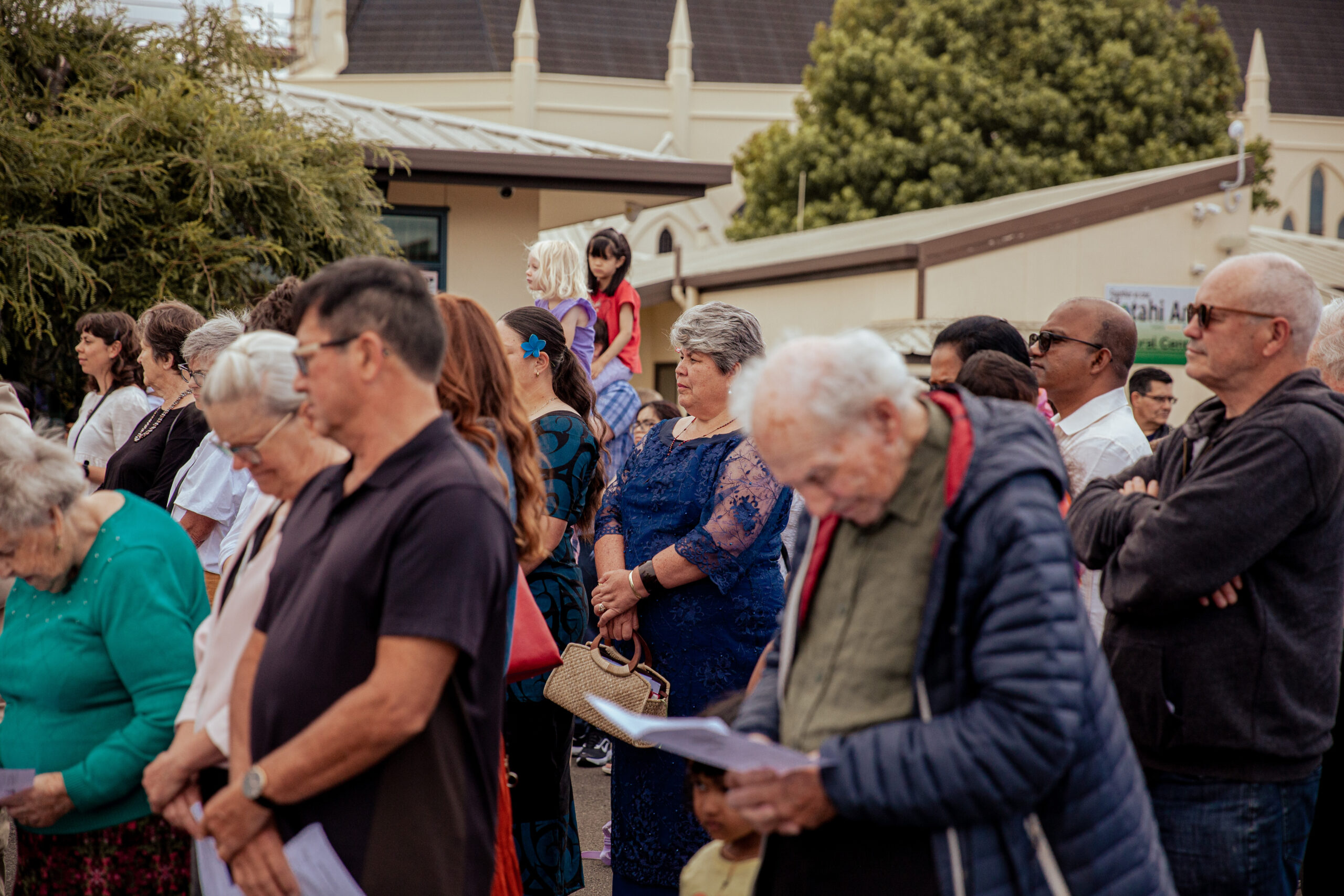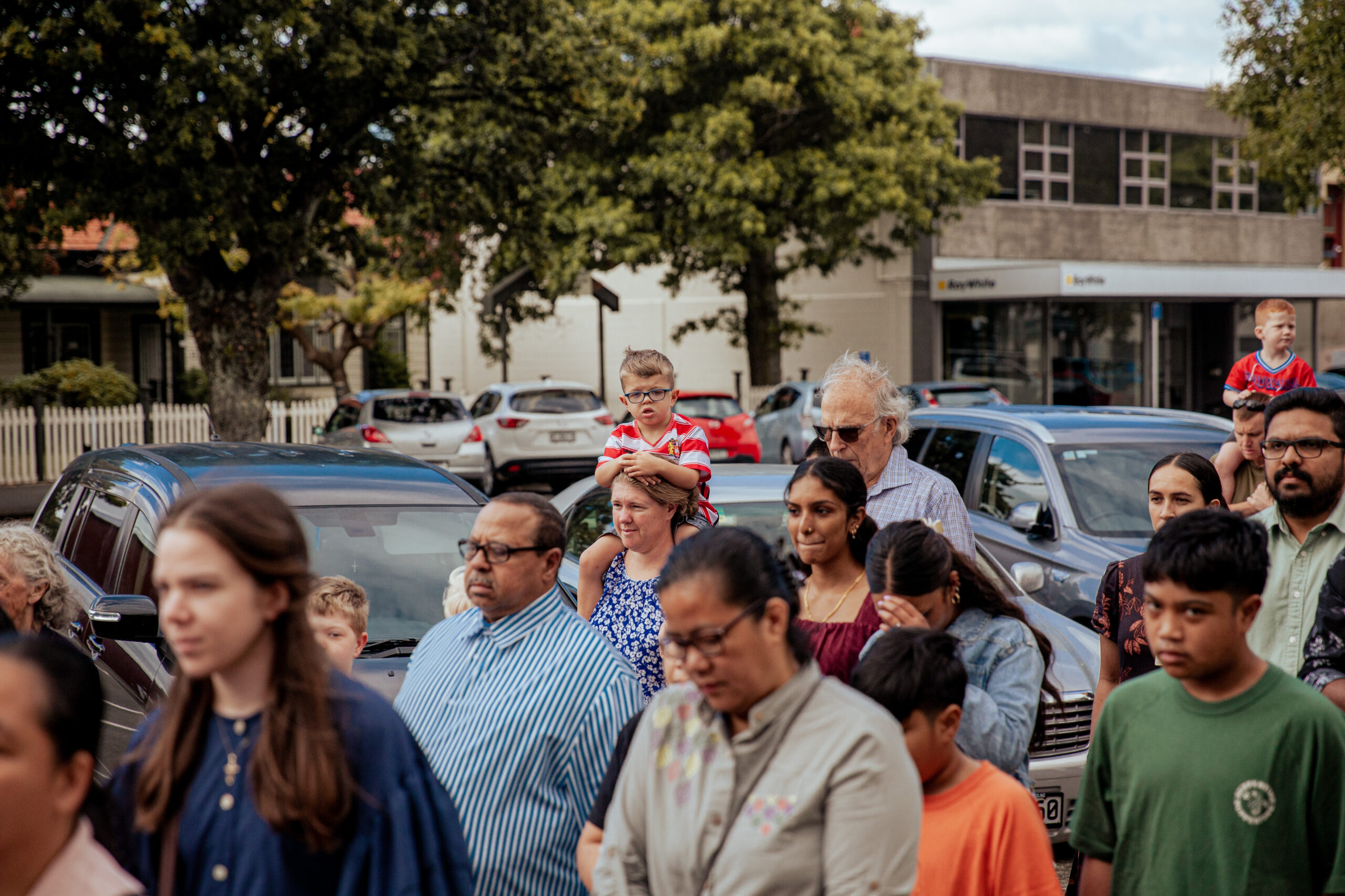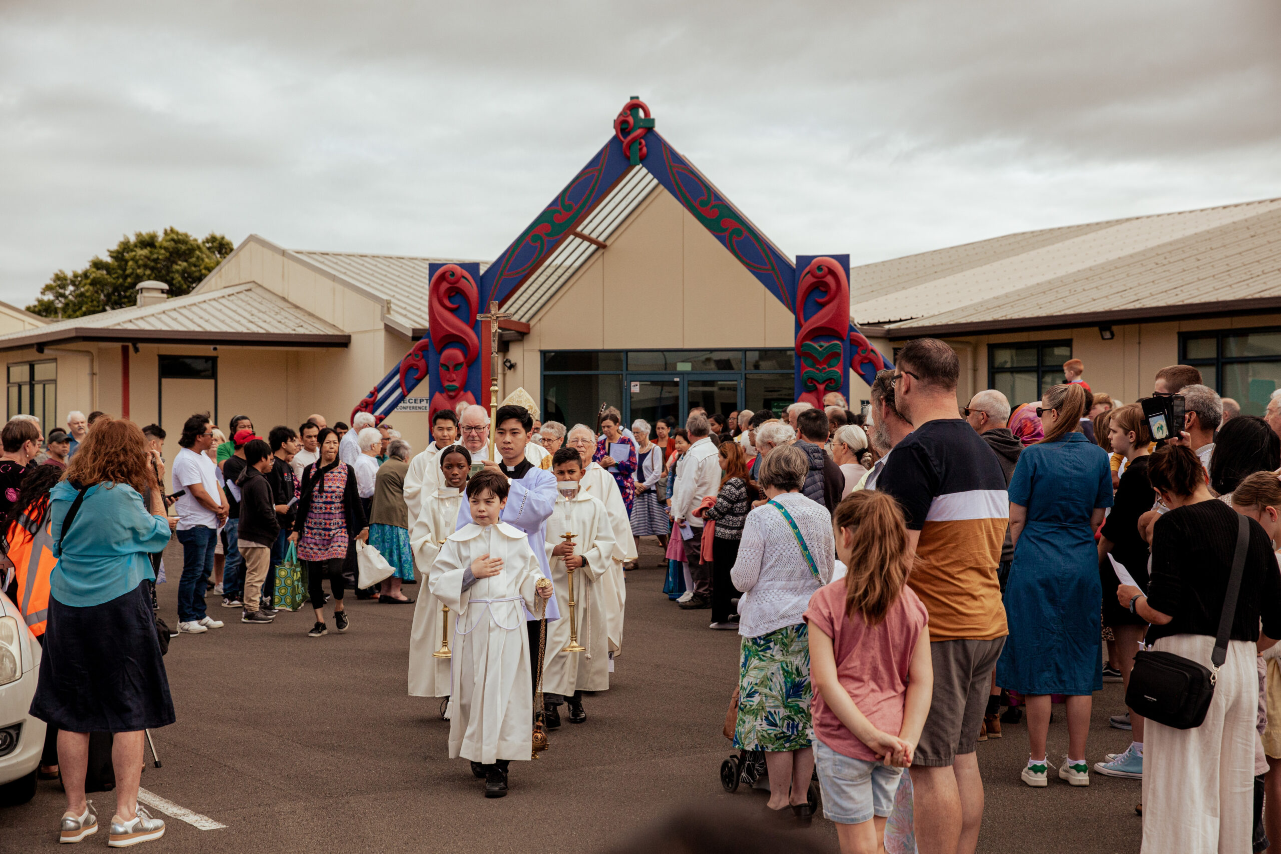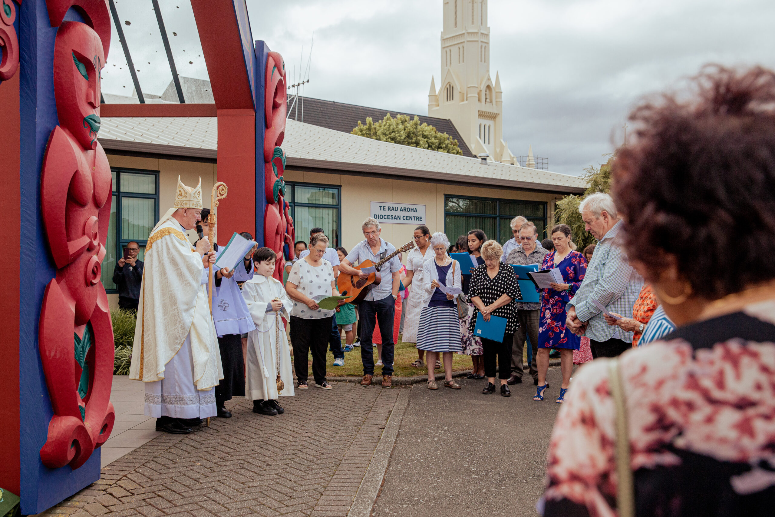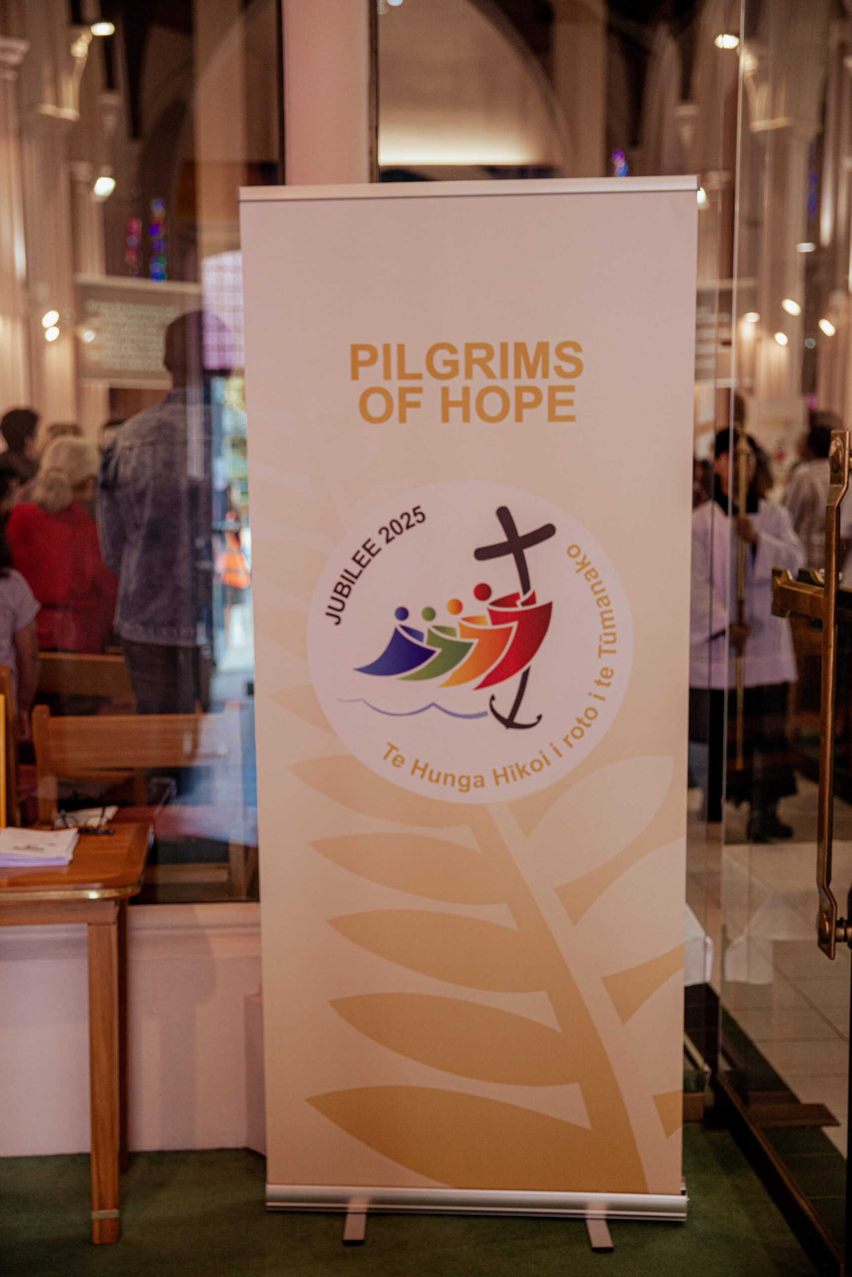 Mass was presided over by Bishop John Adams, assisted by Emeritus Bishop Peter Cullinane, Monsignor Brian Walsh, and Fr Vui Hoang. The liturgy began outside the Diocesan Centre behind the Cathedral, where, fortunately, the rain had stopped just in time. A karanga welcomed those gathered, followed by prayers led by Bishop John. The congregation then processed along Broadway Avenue to the steps of the Cathedral, symbolising the beginning of our pilgrim journey in this Jubilee Year. At the Cathedral doors, Bishop John offered further prayers before blessing the entrance and proclaiming the start of the journey ahead. The Proclamation of Pope Francis’ Papal Bull was then read aloud before the Cathedral doors were opened, and Bishop John led the congregation inside, where the Mass continued as usual.