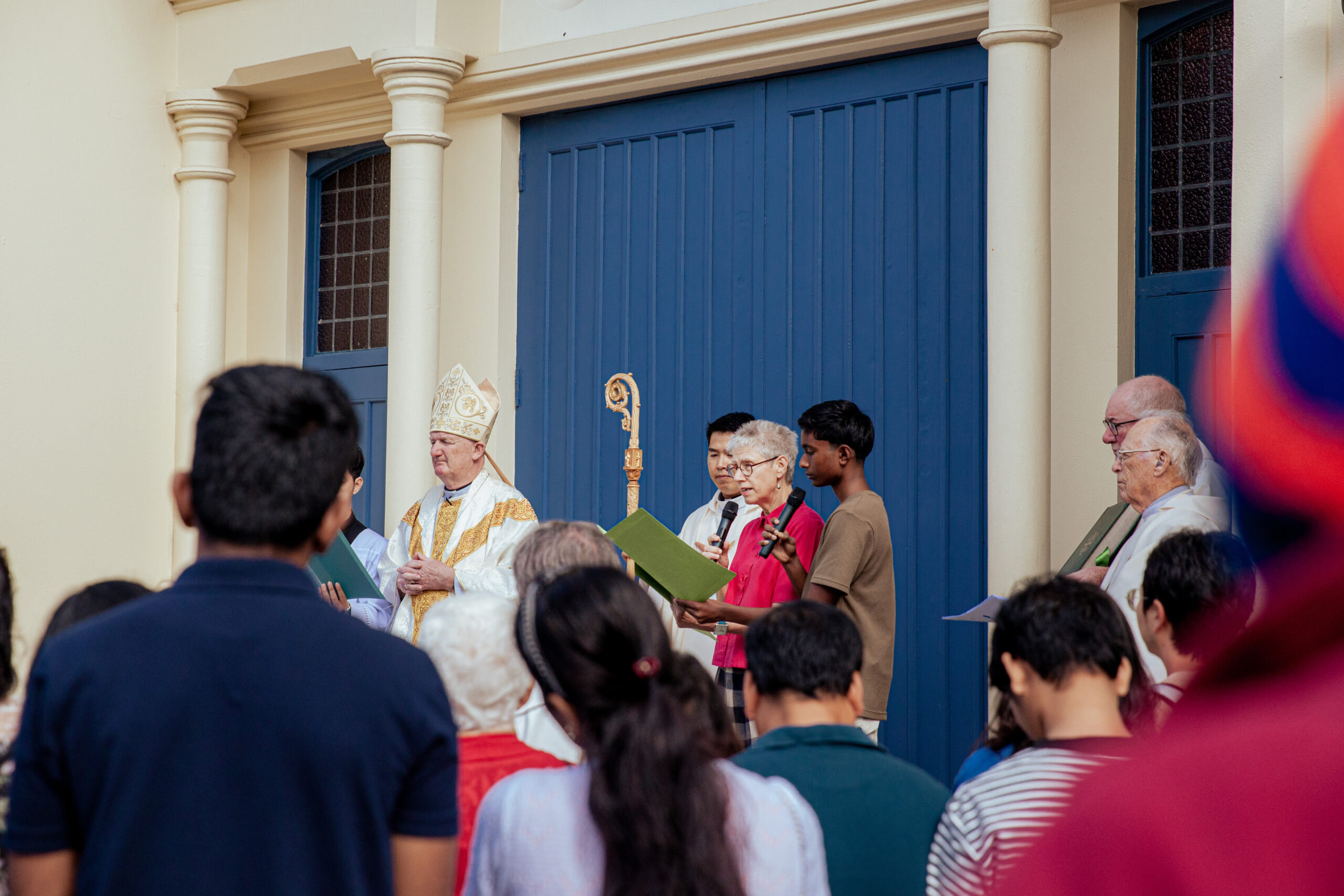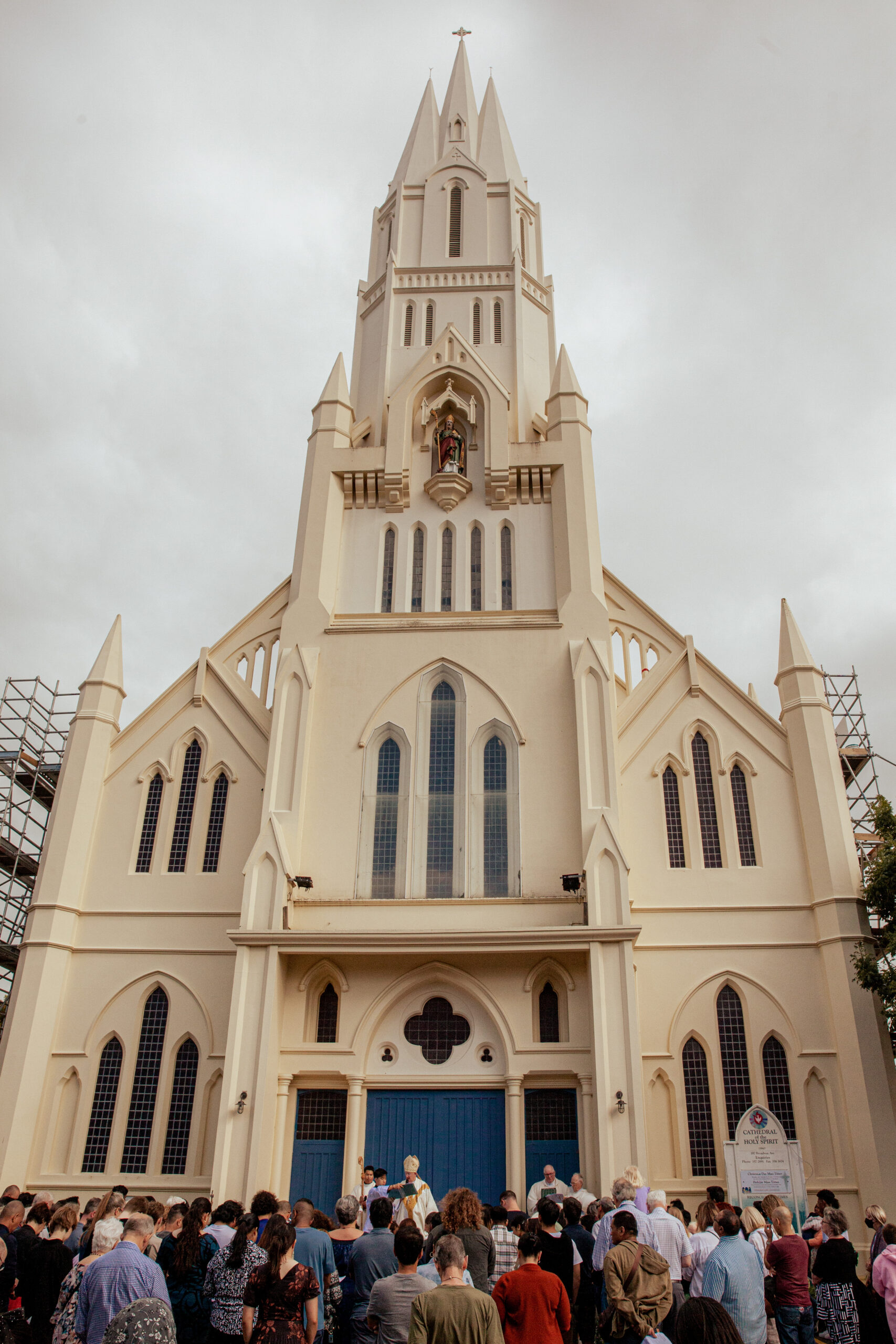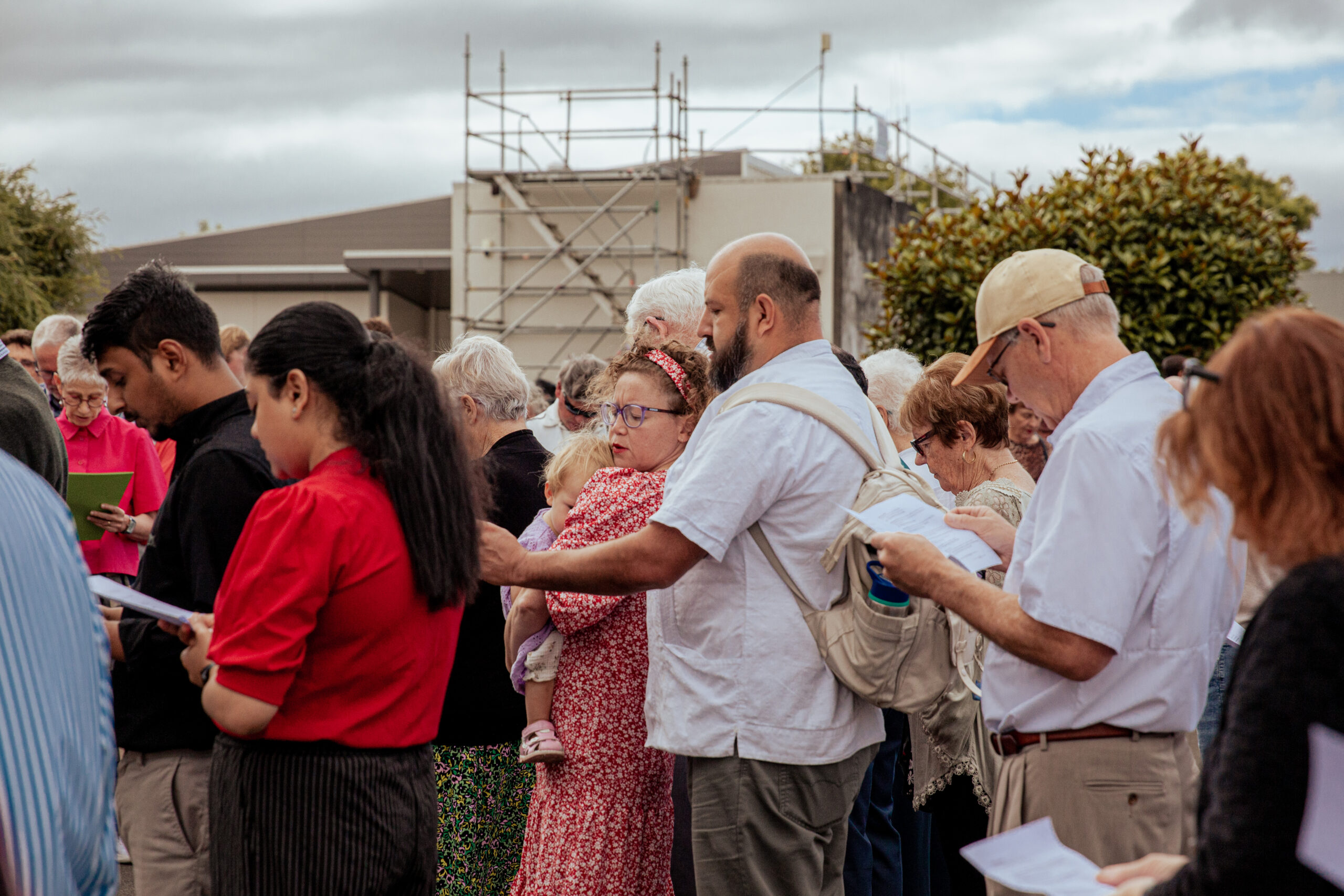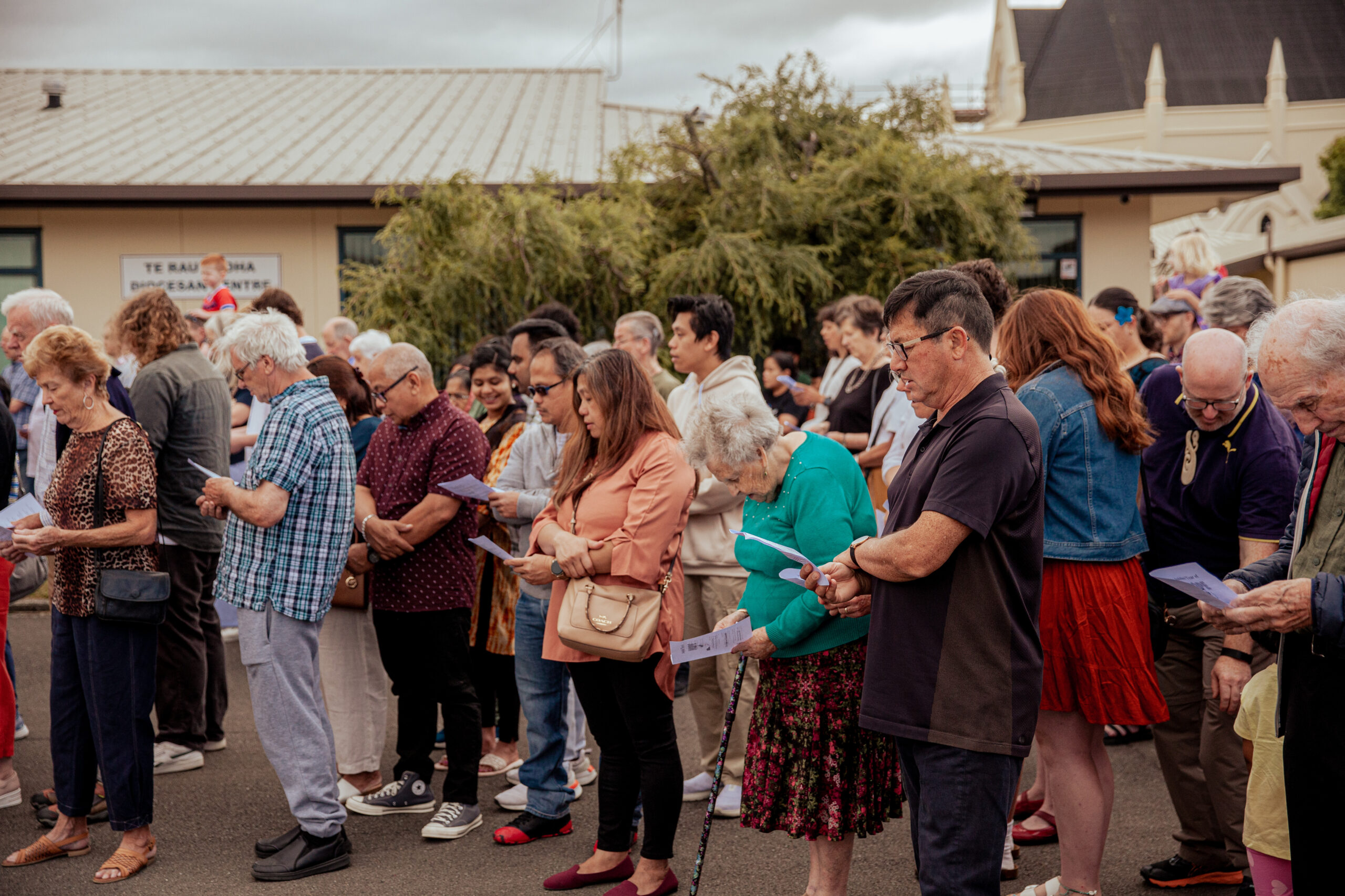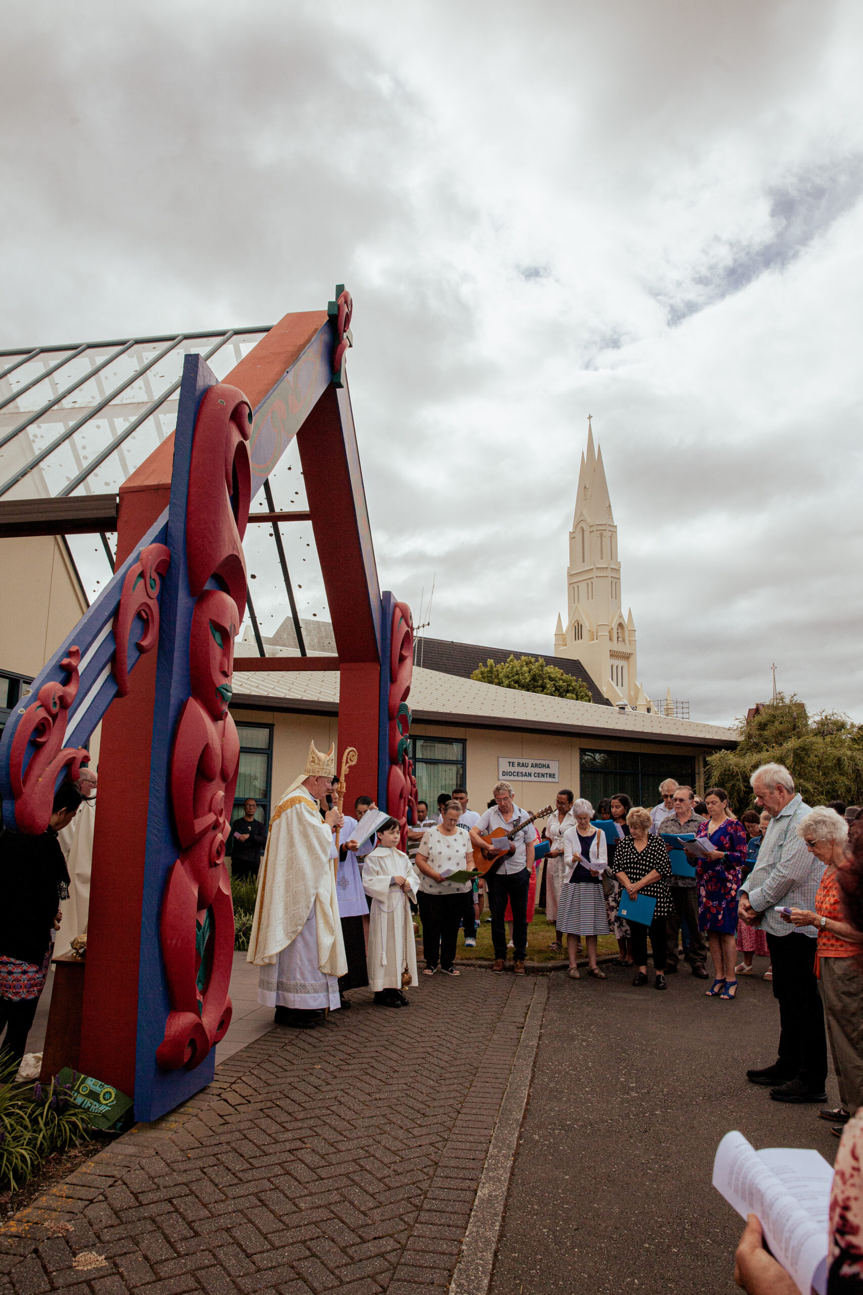 Mass was presided over by Bishop John Adams, assisted by Emeritus Bishop Peter Cullinane, Monsignor Brian Walsh, and Fr Vui Hoang. The liturgy began outside the Diocesan Centre behind the Cathedral, where, fortunately, the rain had stopped just in time. A karanga welcomed those gathered, followed by prayers led by Bishop John. The congregation then processed along Broadway Avenue to the steps of the Cathedral, symbolising the beginning of our pilgrim journey in this Jubilee Year. At the Cathedral doors, Bishop John offered further prayers before blessing the entrance and proclaiming the start of the journey ahead. The Proclamation of Pope Francis’ Papal Bull was then read aloud before the Cathedral doors were opened, and Bishop John led the congregation inside, where the Mass continued as usual.