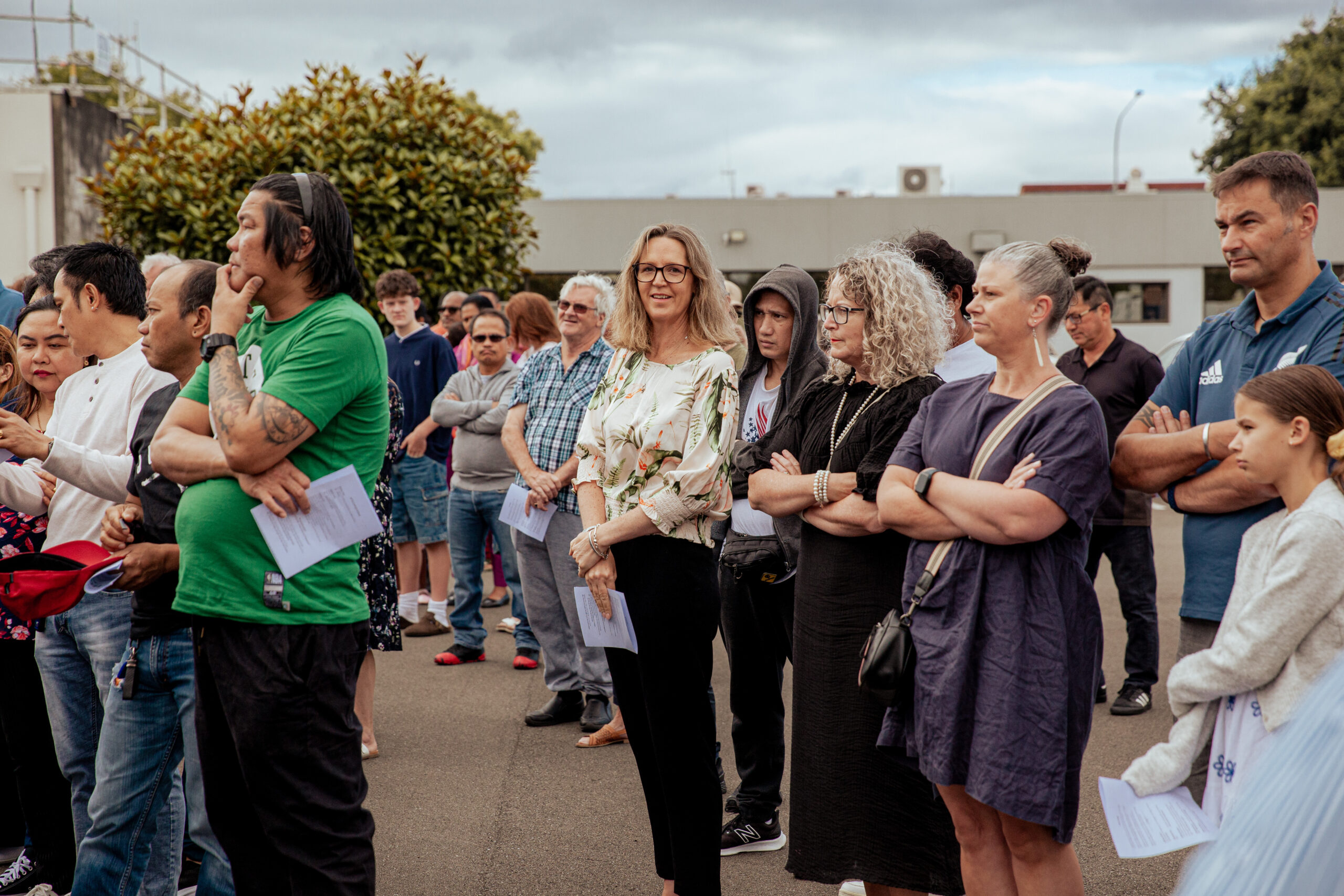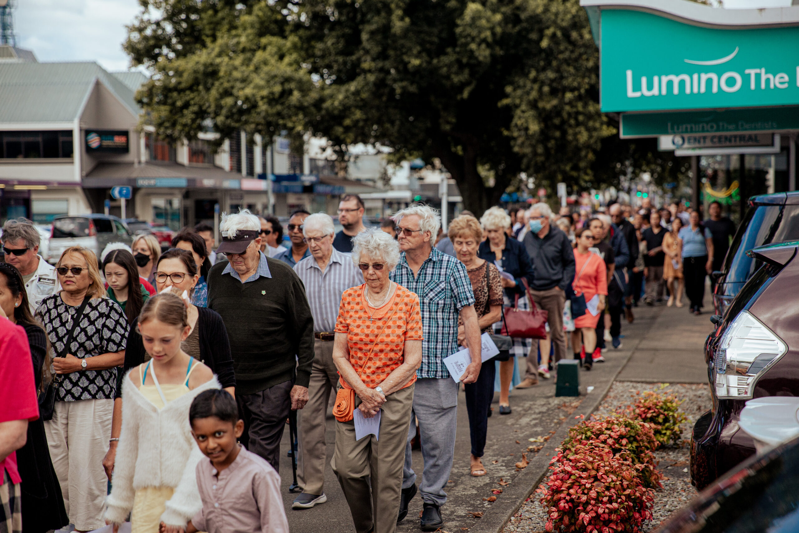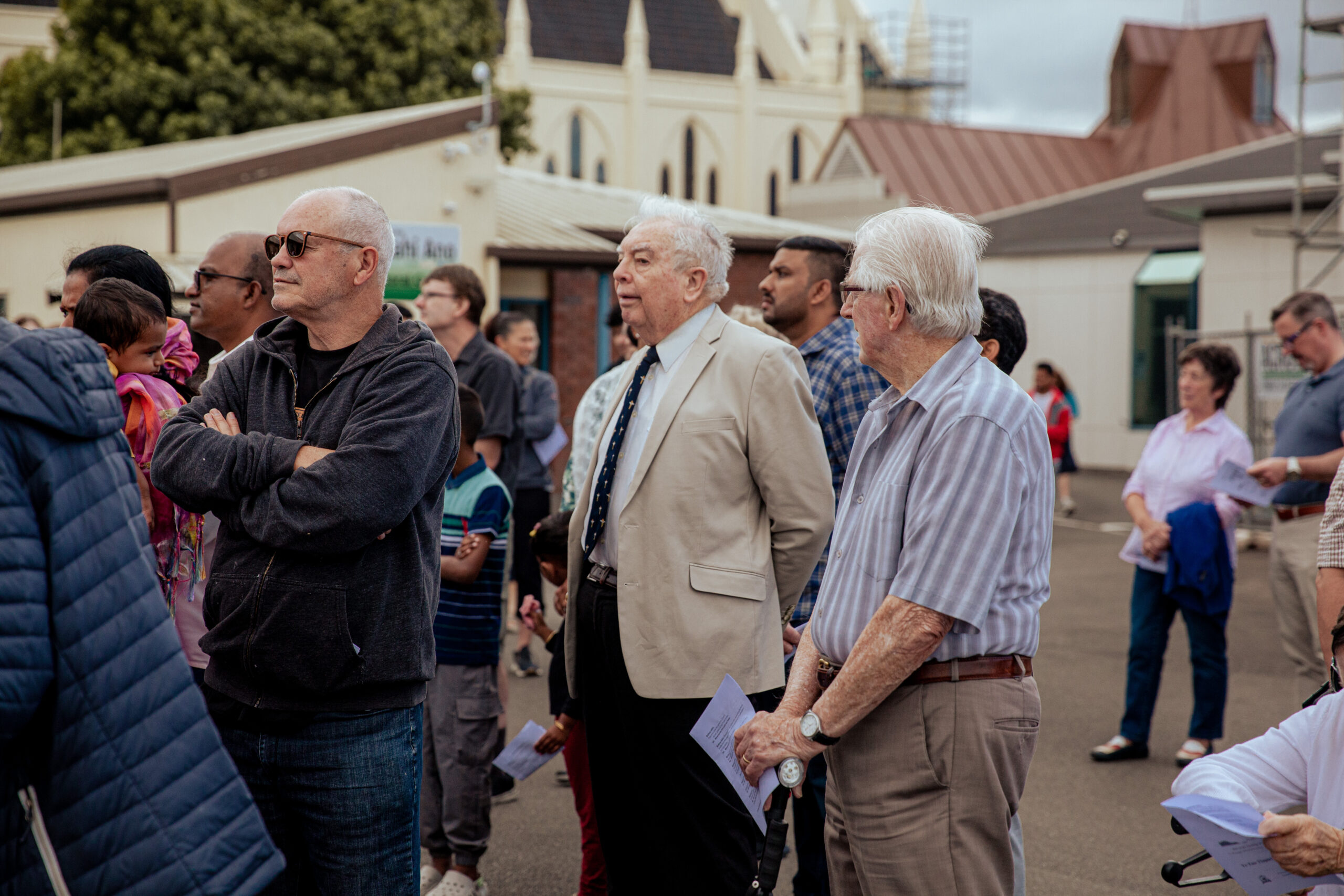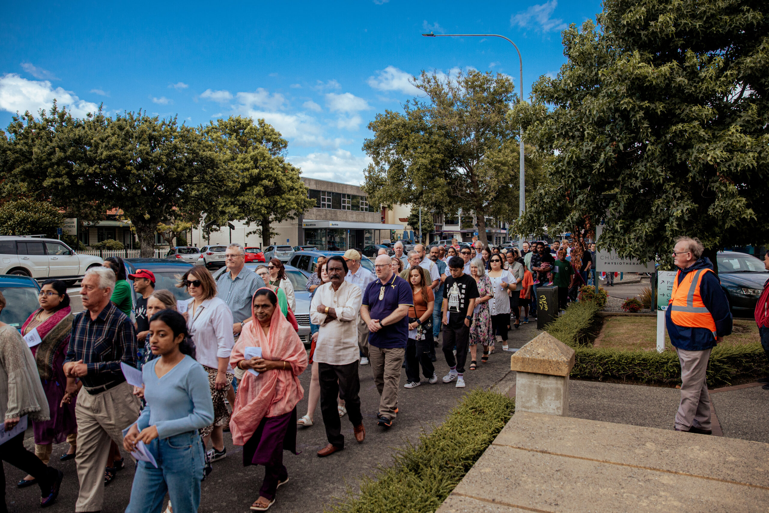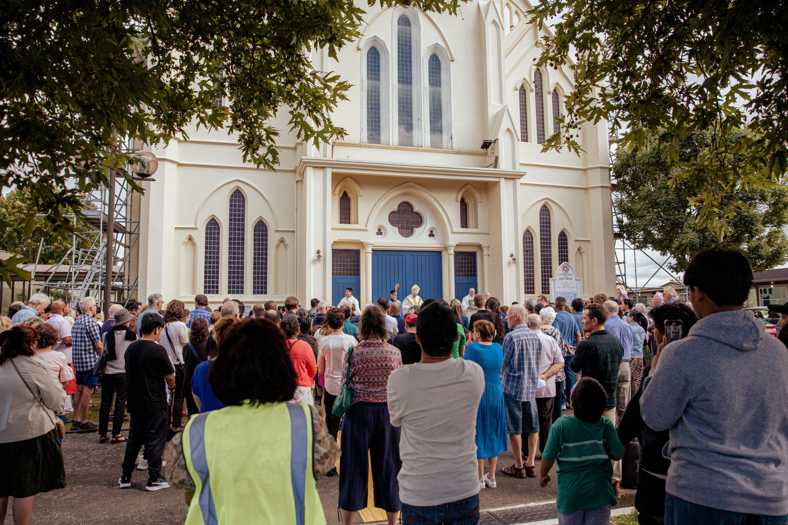 Mass was presided over by Bishop John Adams, assisted by Emeritus Bishop Peter Cullinane, Monsignor Brian Walsh, and Fr Vui Hoang. The liturgy began outside the Diocesan Centre behind the Cathedral, where, fortunately, the rain had stopped just in time. A karanga welcomed those gathered, followed by prayers led by Bishop John. The congregation then processed along Broadway Avenue to the steps of the Cathedral, symbolising the beginning of our pilgrim journey in this Jubilee Year. At the Cathedral doors, Bishop John offered further prayers before blessing the entrance and proclaiming the start of the journey ahead. The Proclamation of Pope Francis’ Papal Bull was then read aloud before the Cathedral doors were opened, and Bishop John led the congregation inside, where the Mass continued as usual.