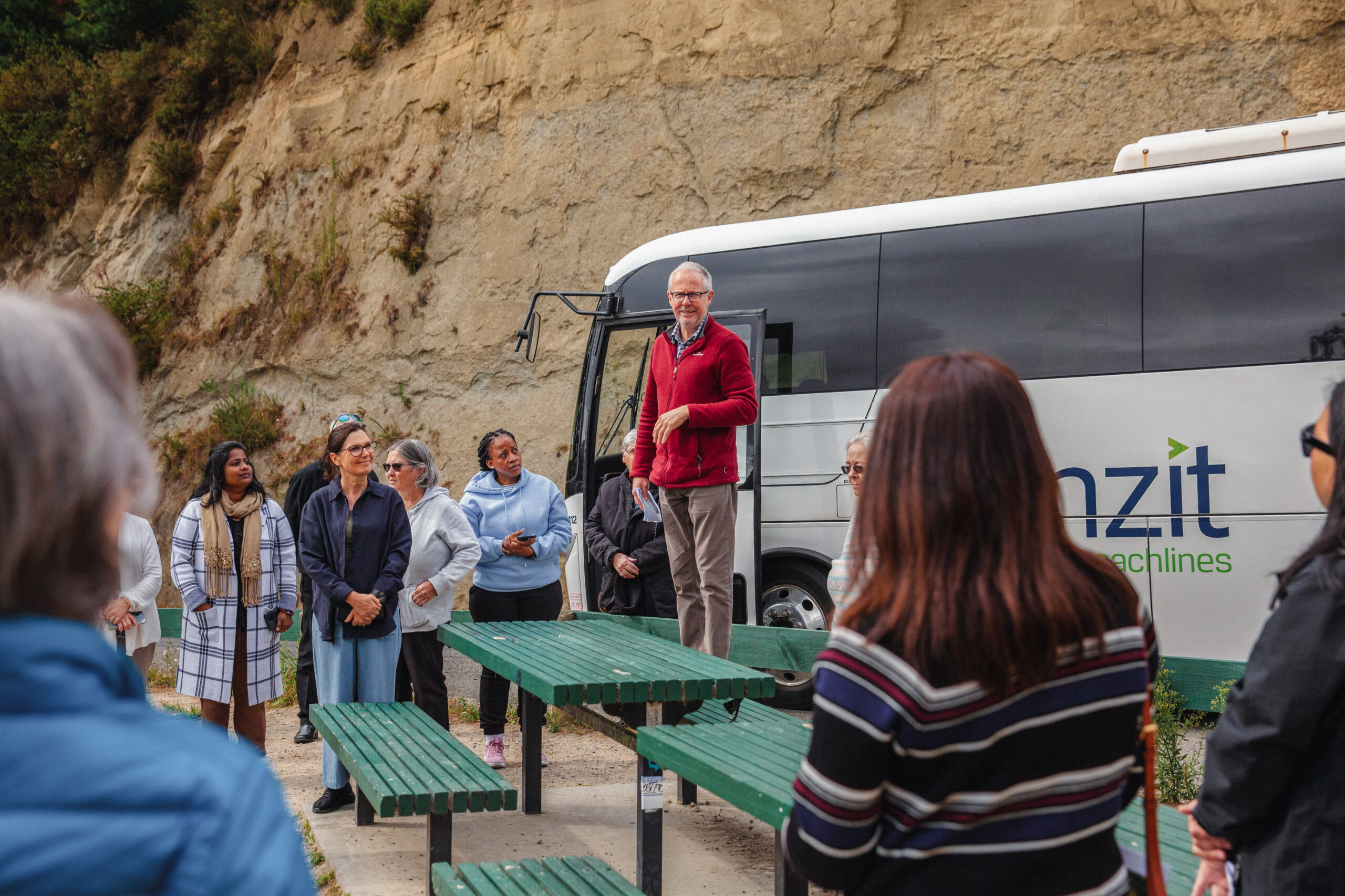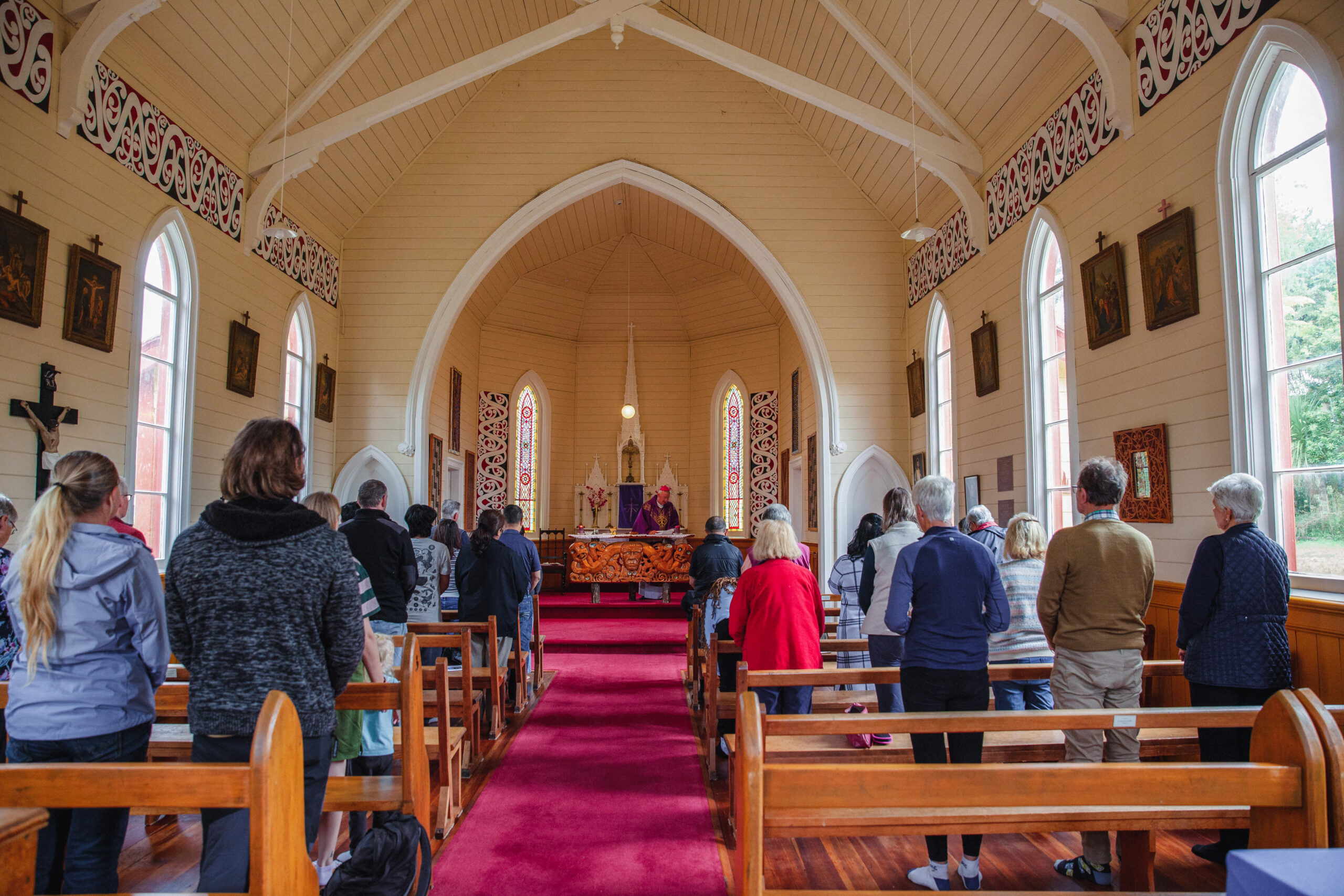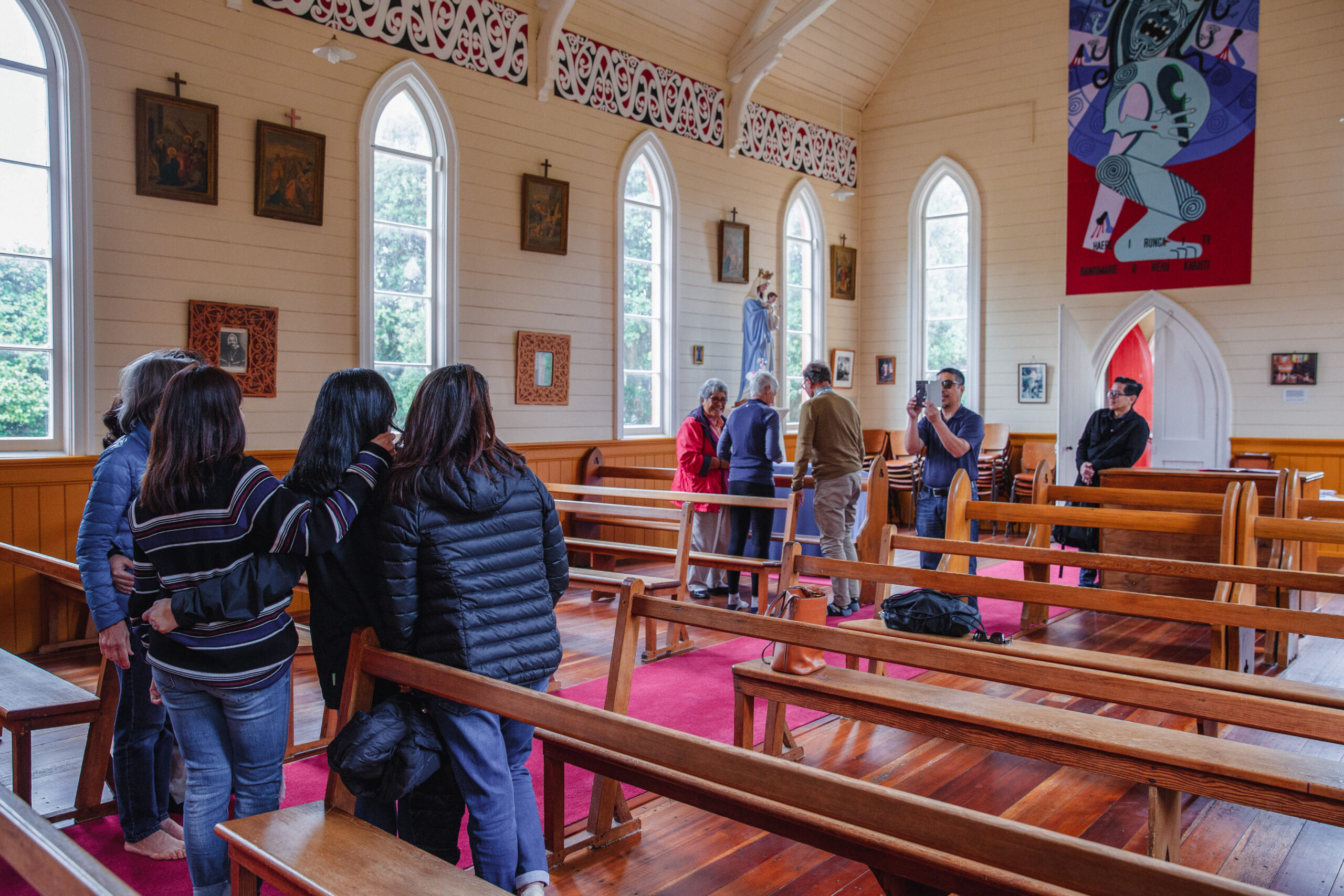 The journey began at the Cathedral of the Holy Spirit in Palmerston North, where pilgrims boarded a bus to Whanganui. A brief stop at St Mary’s Church in Whanganui allowed for a toilet break and the collection of additional pilgrims from New Plymouth before the group continued along the scenic River Road.