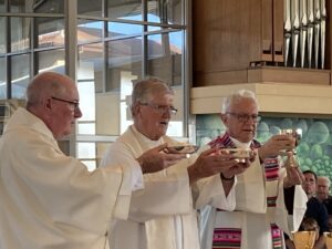Fifty years later, on 11 May 2025, the three priests came together once more at St Joseph’s Church in New Plymouth to celebrate their Golden Jubilees. It was a glorious autumn day, marked by a joyful Mass shared with family, friends, and parishioners. Each priest offered their own homily, reflecting on the insights and experiences of their priestly journey over the past five decades.