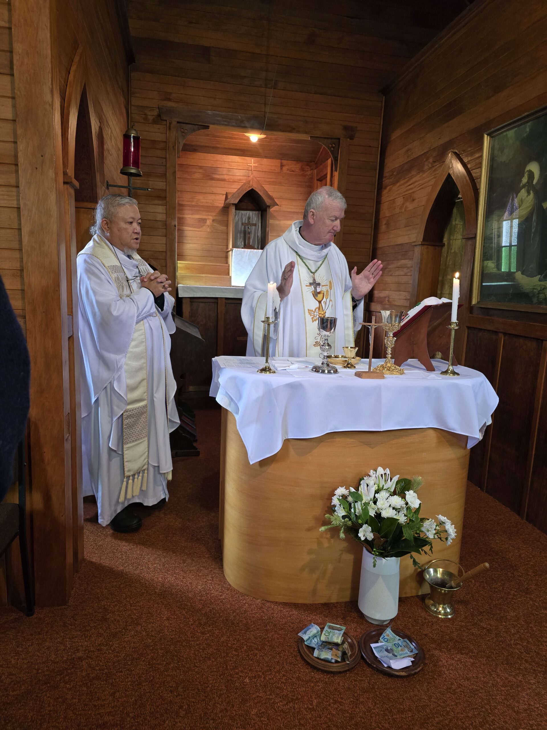 In his homily, Bishop John reflected on the origins of Pongaroa, which developed around 1890 as a forestry service centre, before transitioning to support local beef and sheep farming. While the expected railway line bypassed Pongaroa, a Catholic church was eventually established to meet the spiritual needs of the growing community.