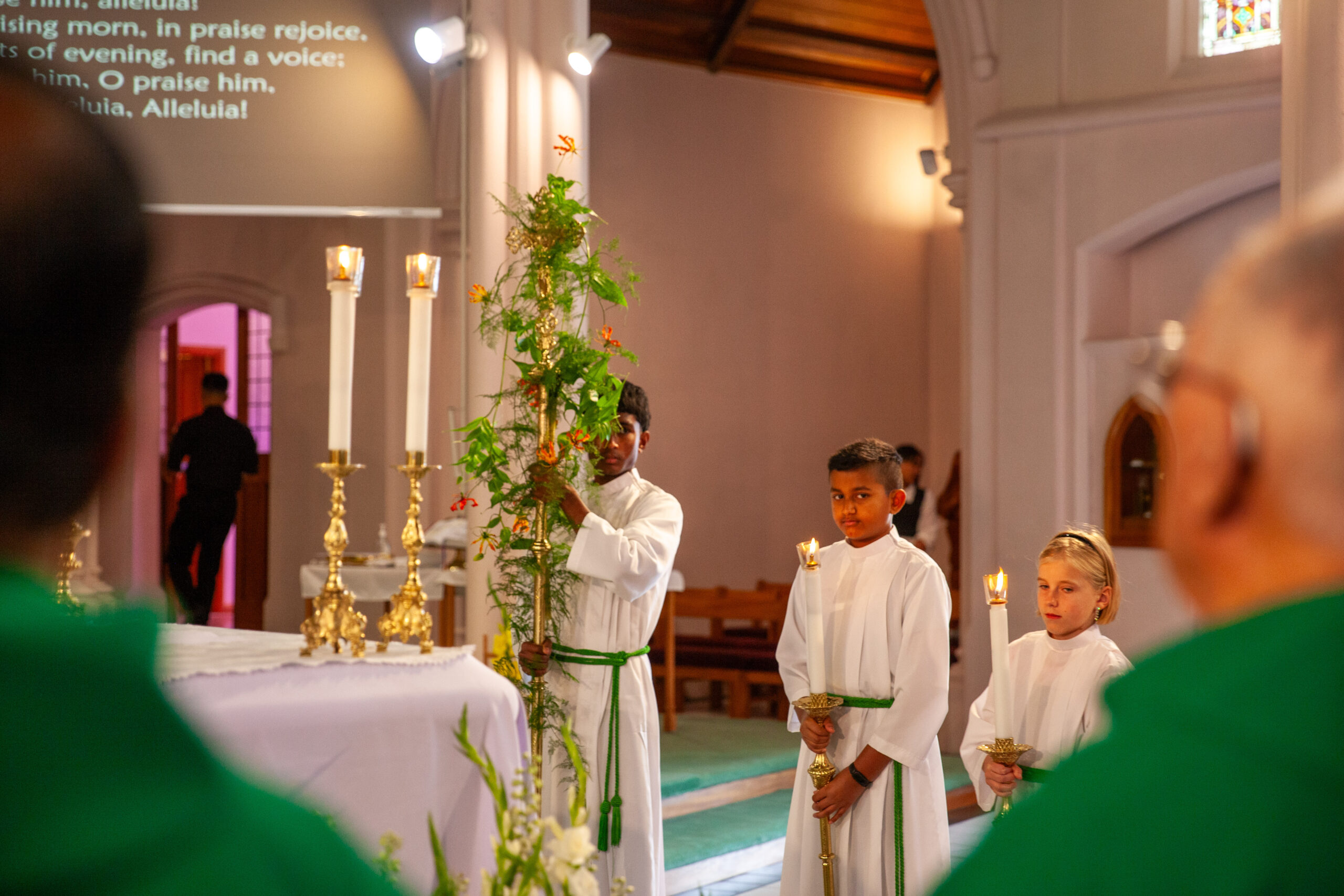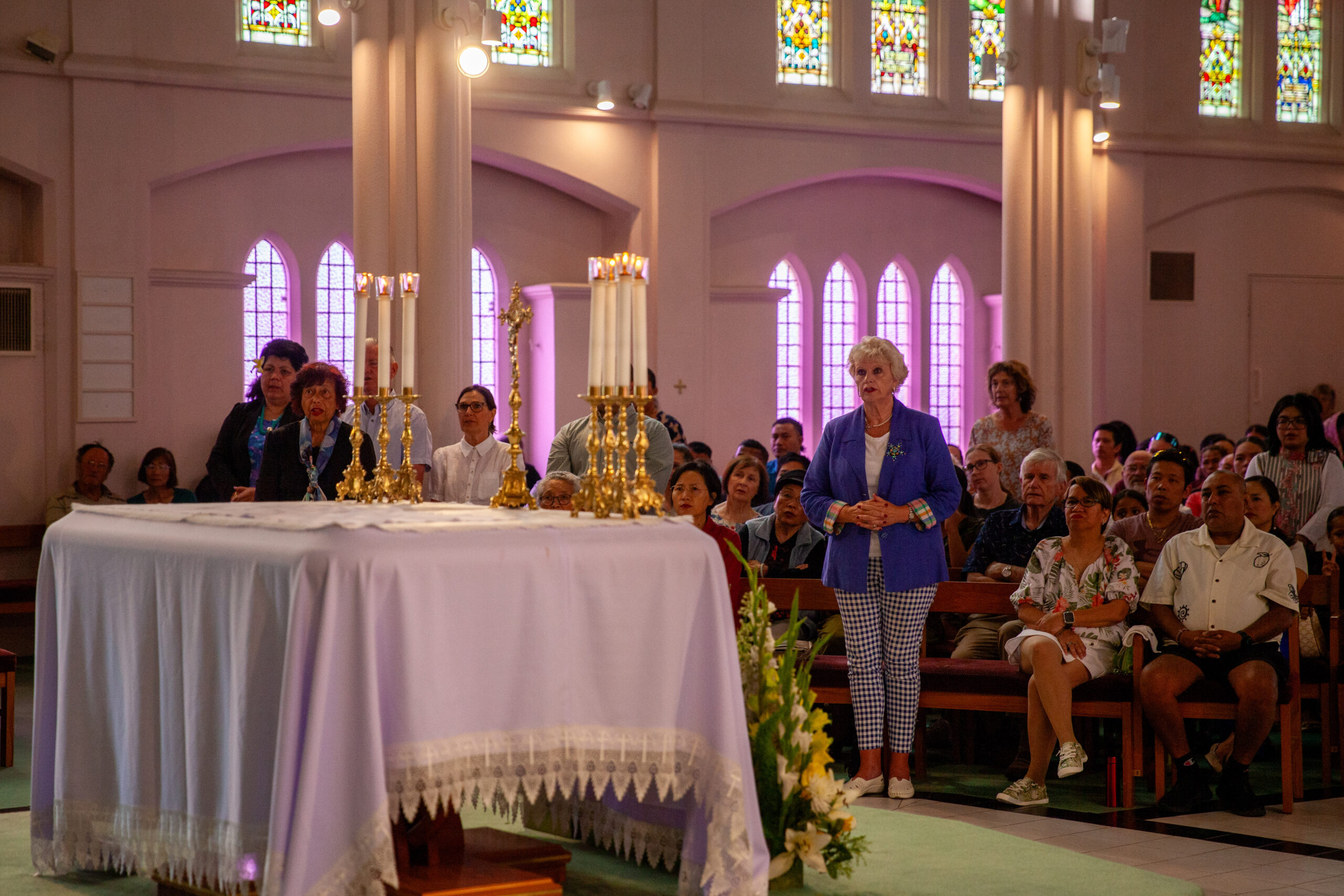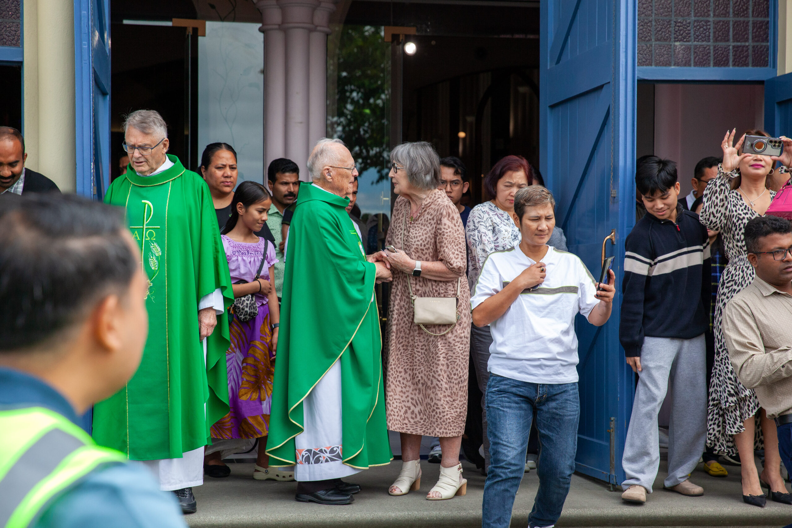 The Mass began with the official Closing Rite from Rome, marking the conclusion of the Holy Year. Concelebrating clergy included Bishop John Adams, Bishop Peter, and priests from neighbouring parishes, including Father Peter from the Kāpiti Coast and Father Vijoy from St Mary’s.
