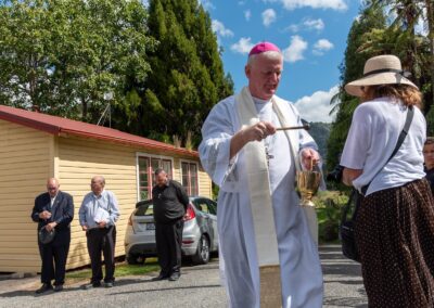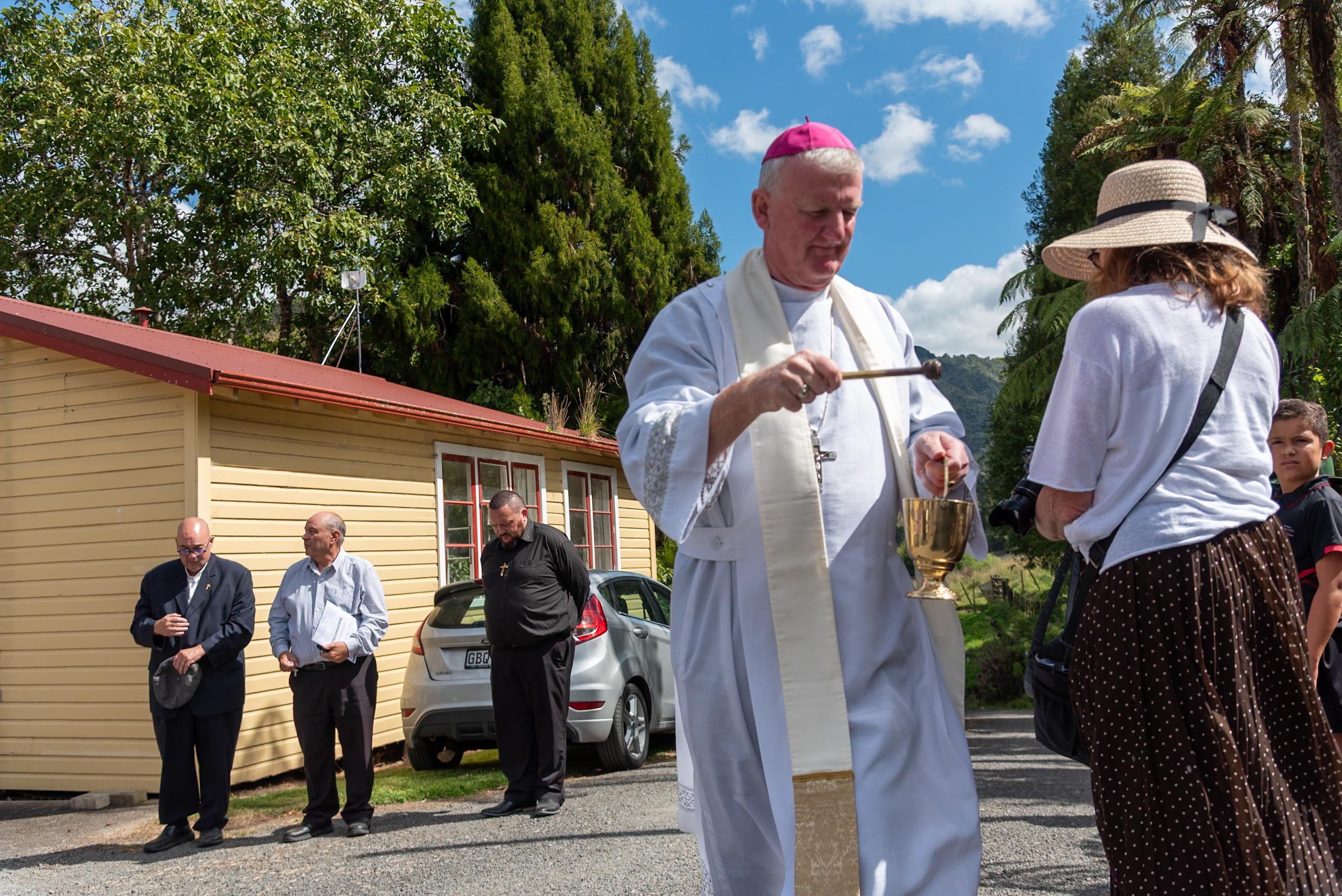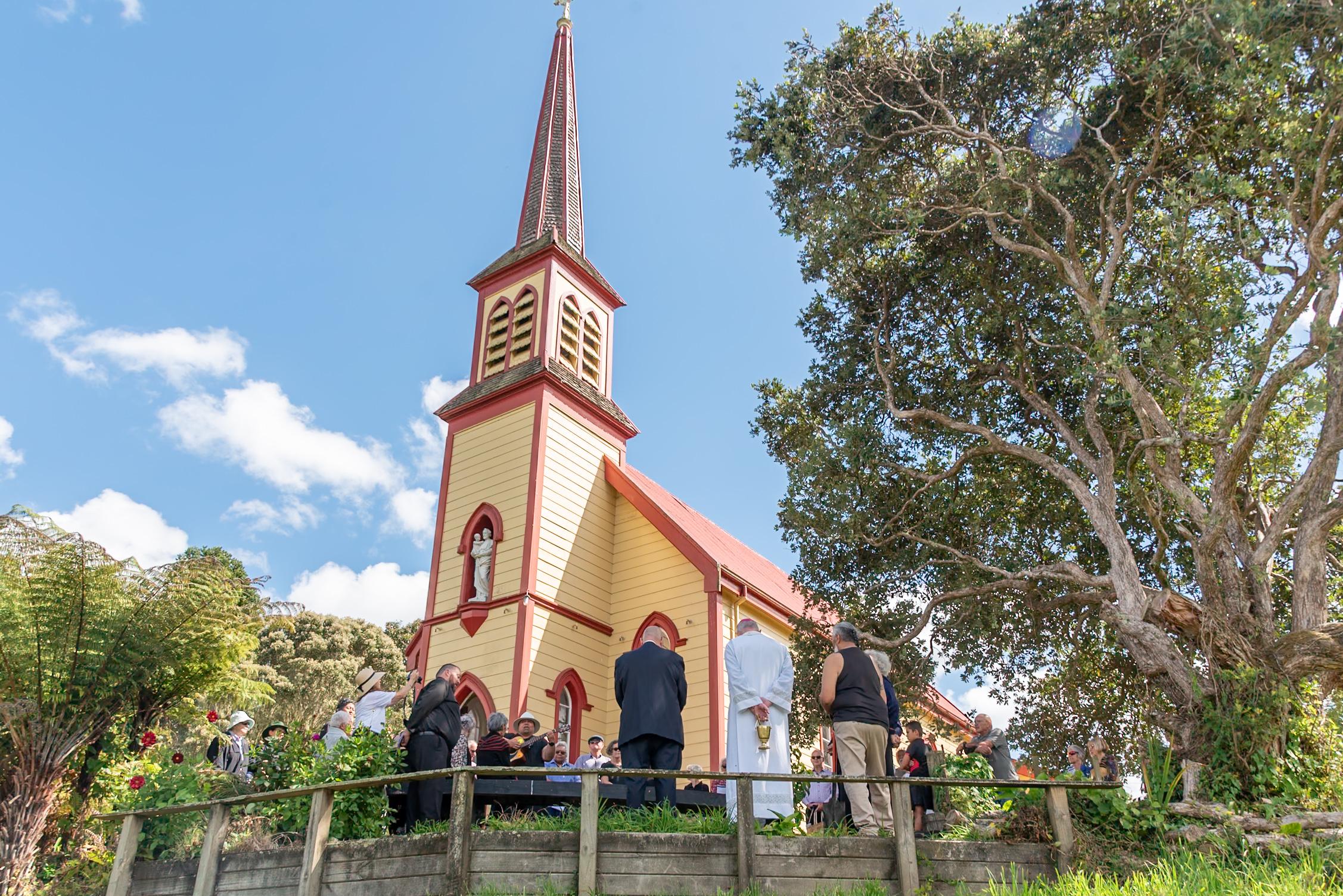 Over a hundred people with links to Hiruhārama joined the celebrations. The proceedings began with a Pōhiri on to Patiarero Marae, followed by formal speeches on the Hiruhārama grounds. Bishop John Adams conducted the blessing of the convent and church, and led the Mass at the restored St Jospeh’s Church.